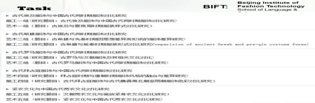 同時,作為特色院校,我們要更加注重將外語教學與學校主流學科融合,本科普通班大學英語、本科實驗班大學英語、研究生英語、博士生英語、國際生英語,面對不同層次、不同受眾對象、不同的發展目標,英語教學一定要特色鮮明,及早培育成熟的特色課程,鼓勵教師大膽上線。正如郭燕教授督導過程中看到訾老師教學過程體現出的特色,結合藝設和服裝設計專業學生專業學習,分小組,完成各歷史時期中西方服裝服飾比較研究,以PPT研究形式,每次課上,兩位同學各自用5分鐘時間,進行英語口語演講,并作為期末Oral Examination(口語考試)成績。分小組選題如下列PPT展示: