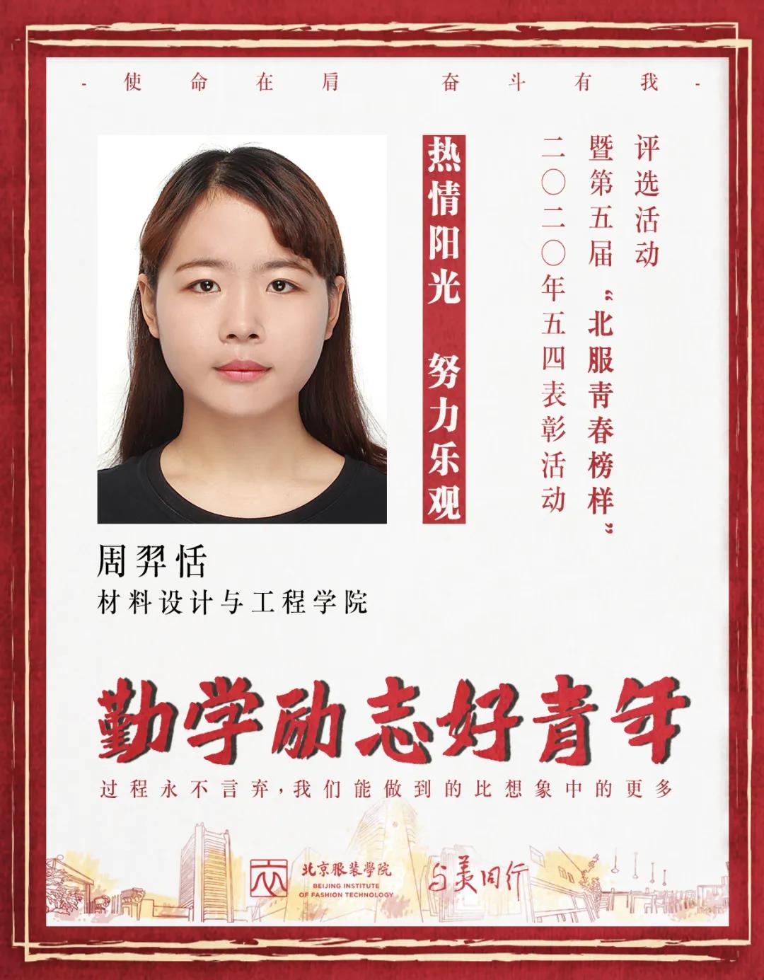 平易近人,謙虛好學(xué)是她待人接物秉承的原則;踏實(shí)認(rèn)真,戒驕戒躁是她處理工作恪守的準(zhǔn)則;積極進(jìn)取,不斷創(chuàng)新是她組織活動(dòng)堅(jiān)持的標(biāo)準(zhǔn)。作為一名北服學(xué)生干部,北京市“優(yōu)秀學(xué)生干部”、北京服裝學(xué)院“優(yōu)秀團(tuán)干部”、70周年群眾游行活動(dòng) “訓(xùn)練之星”以及“先進(jìn)個(gè)人”,斬獲無(wú)數(shù)個(gè)人榮譽(yù)的她始終堅(jiān)守著心中的執(zhí)著,那就是攜手北服青年,共同開(kāi)創(chuàng)更加輝煌的成績(jī),用自己的青春力量書(shū)寫無(wú)愧于這個(gè)時(shí)代的最美頌歌。