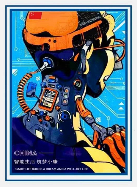 中國信息化社會高速運行,作品選擇了以”互聯網+”和“5G生活”作為創作的切入點,畫面以人工智能作為主體,背景加入了機械元素,以此呼應智能生活的主題。機器人頭部添加了“5G-CHINA”的元素,配色上以紅藍對比色為主, 呼應筑夢小康的主題。