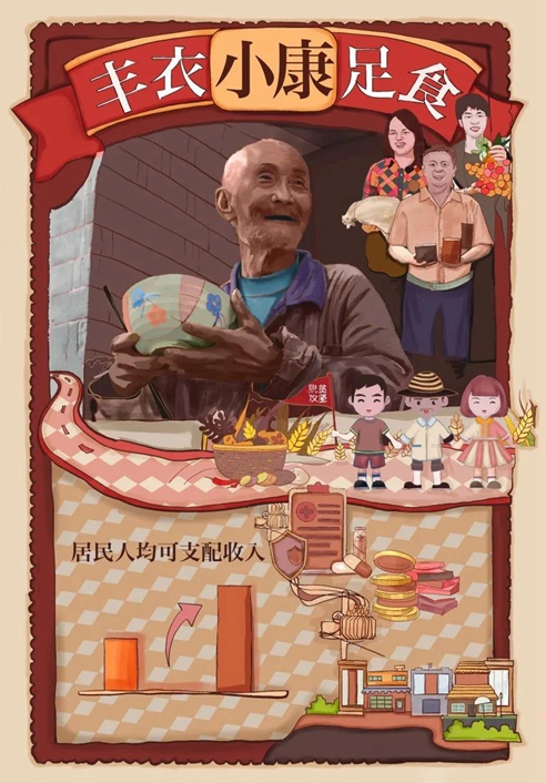 作品主要展示了建設小康社會以來的重要成果與人民幸福的一些美好畫面,令人看到后倍感欣慰、倍受鼓舞。黑白配色沖擊力比較強,更能體現中國從困難時期到筑夢小康時期的美好景象,讓改變歷歷在目。