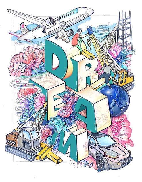 本作品將“夢想”這個單詞拆解成積木形態,結合祥云紋樣表達出中國夢的概念;在畫面中運用了工程吊車元素,表達共筑中國夢的主題。周圍綻開的花卉,以及先進的代步工具,是祖國繁榮的象征,也是人們奔向小康社會美好生活的象征。借此作品表達自己對祖國的美好祝?!睒s昌盛,齊心協力,早日實現中國夢!