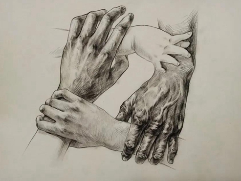 男女老少互相握住的手表示相互依賴、相互扶持,表達出對于未來大同社會“老吾老以及人之老,幼吾幼以及人之幼”的暢想,也是對和諧社會的表達。