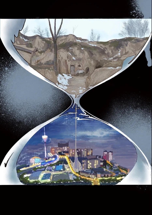 以沙漏為載體,比喻時間流逝,在黨的帶領下,一代又一代人民堅持不懈地努力,把昔日貧瘠的土地變成燈火輝煌的現代化城市。這就是共竣小康、筑夢未來!