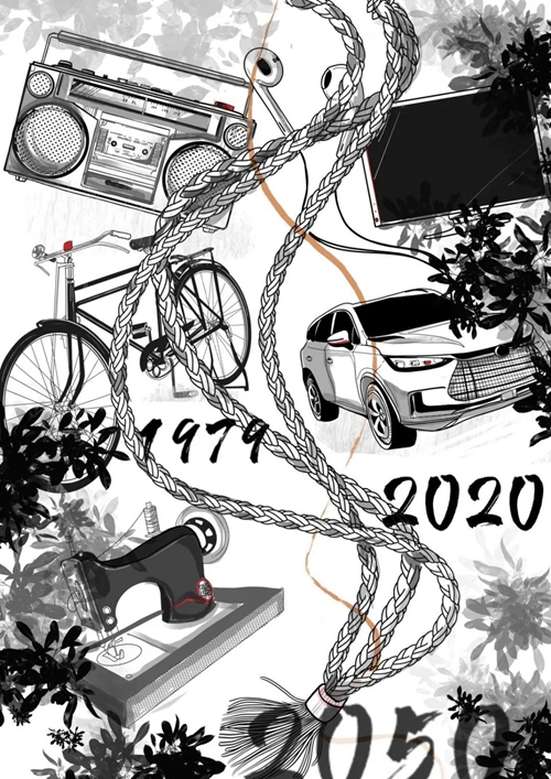 從1979到2020,中國社會一步步邁向小康,人們的生活發生了天翻地覆的變化。從二八大杠到家家常見的轎車,從磚塊錄音機到便攜耳機、液晶大電視……時間像一條繩,凝結著我們的心血和年華;時代是一條緊實的繩結,把全中國緊緊擰在一起,共同奔向美好的新未來。