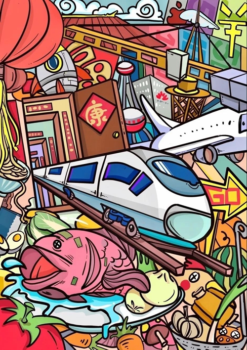 畫面中的各種食材代表了人們富裕殷實的生活;飛機、塔吊等現代科技與建筑表達了祖國高速發展所帶來的繁榮昌盛;畫面的中心位置是一輛從代表著家家小康的房門里行駛出來的高鐵,將帶領我們去往更加民康物阜的遠方。
