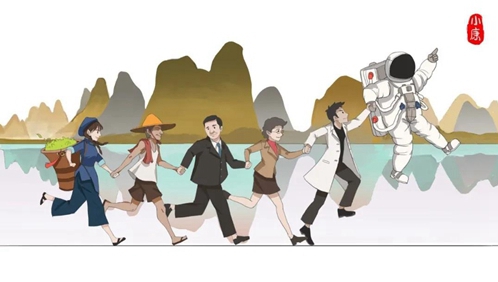 畫面由不同領域的代表性人物組成,農民、國家公務員、教師、科技工作者手牽手一起奔跑,體現了脫貧致富奔小康一個都不落下的理念。隊伍由宇航員引領,騰飛向上的隊形象征著科技引領下的社會飛速發展。只有各民族人民攜手共進,才可以更快更好地實現全面小康。
