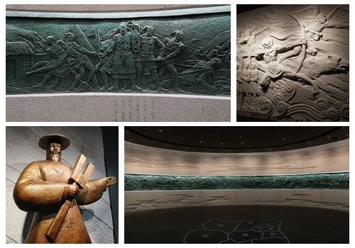 1.序廳空間設計:序廳以“光輝肇始、王朝開端、撥云見日、宏基華夏”主題雕塑為起始,追求史詩般的宏大氛圍,著重表現二里頭遺址在夏王朝考古探索歷程中的重要地位。頂部設計巨耒造型,構成空間的發散性和向心性,暗喻二里頭文化的吸收與輻射,同時營造序廳王朝氣象的儀式空間。序廳大型花崗石浮雕壁畫《光輝肇始·宏基華夏》作者:馬天羽、胥昌群、李宏、張玉亮。