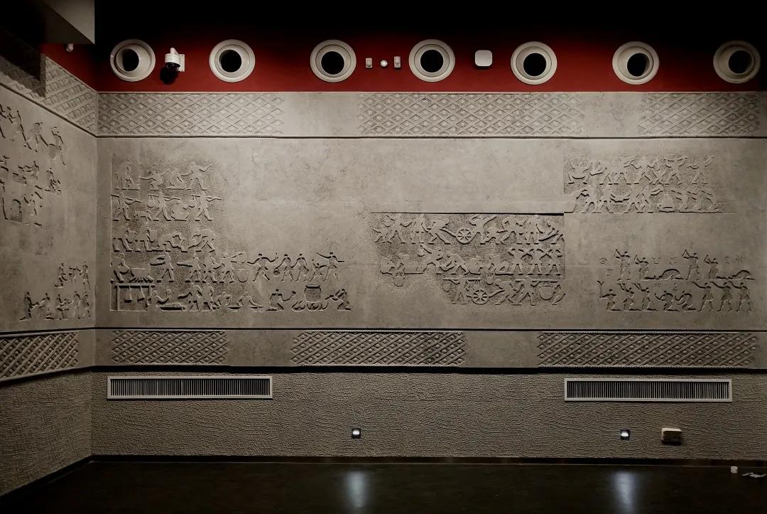 3. “赫赫夏都”的“厥土生民”部分位于第四展廳前半部,圍繞二里頭文化的各等級聚落遺存,較為全面地展現了夏王朝勢力范圍 內人民生產生活的圖景。其中大型石刻藝術飾面《厥土生民》作者:馬天羽、李宏、李佳昱。