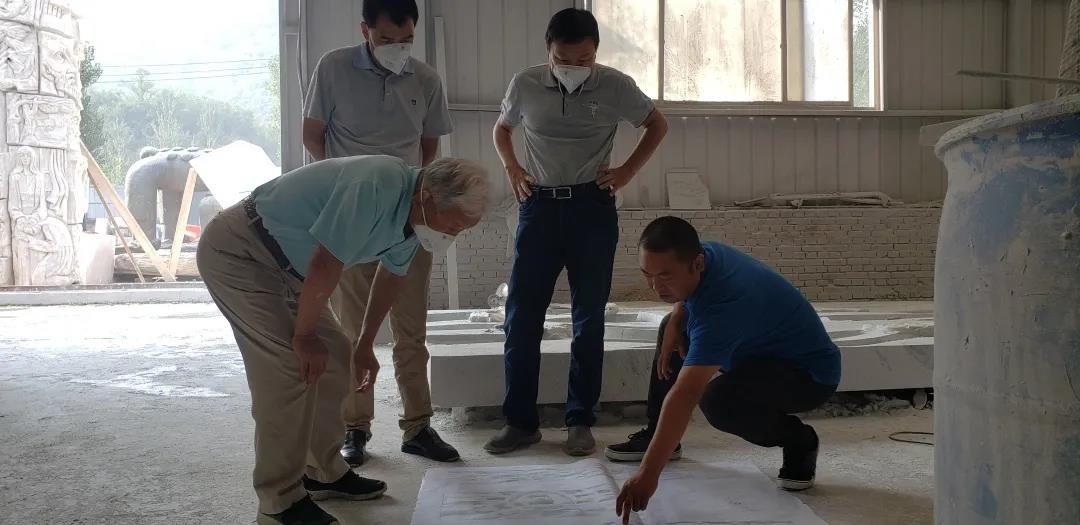 從左至右:北京大學李伯謙、中科院考古所二里頭考古隊副隊長趙海濤、隊長許宏、馬天羽在北京密云石雕工廠研究制作方案