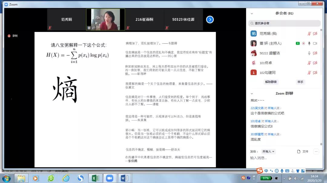 教學(xué)特色:課堂教學(xué)信息量大,指導(dǎo)學(xué)生研究性學(xué)習(xí)。課件及時補充傳播領(lǐng)域最新資訊及學(xué)生的討論發(fā)言和作業(yè)反饋,非常用心。董老師課堂上通過平臺聊天區(qū)及語音對話和學(xué)生溝通順暢,點評及時,課堂錄播回訪使學(xué)生可隨時復(fù)習(xí),教學(xué)效果好。
