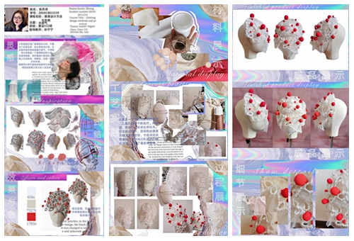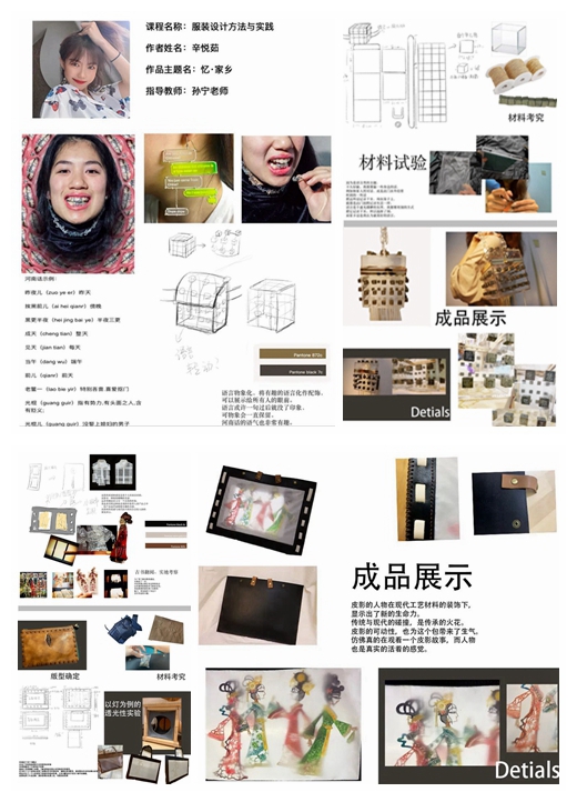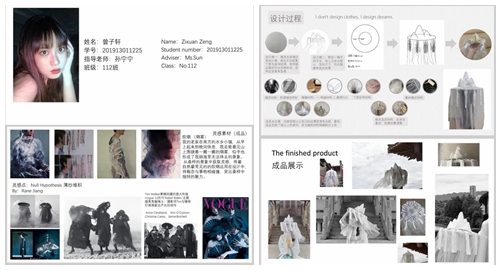 服設19112班的28位同學們克服困難,沒有材料想辦法創造材料,每一件作品反復打磨,多次修改。雖然只有5周的課程,課程的排列也是接近期末,但同學們也沒有絲毫怠慢,在結課后紛紛提交作品提案和實物照片。并有幾位同學對作業精益求精,取得了非常好的表達效果。但因為時間短、任務重,同學們表示如果有更多的時間和更多的材料做選擇將會有更加理想的效果。