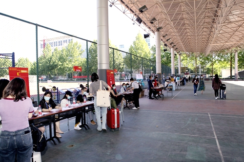 迎新現(xiàn)場洋溢著濃濃溫情。相關(guān)部門、各二級學(xué)院工作人員以及學(xué)生志愿者們有條不紊地忙碌著。查驗核酸檢測陰性證明、健康碼,測量體溫、核對身份信息、搬運行李、解疑答惑等環(huán)節(jié)井然有序。前來報到的研究生們面帶笑容、精神愉悅,時而忙于核對材料、搬運行李,時而對老師和志愿者們表示感謝,時而抬頭領(lǐng)略校園風(fēng)光。“一站式”服務(wù)點——風(fēng)雨操場相關(guān)工作人員井然有序,協(xié)助新生完成入校報到手續(xù)。