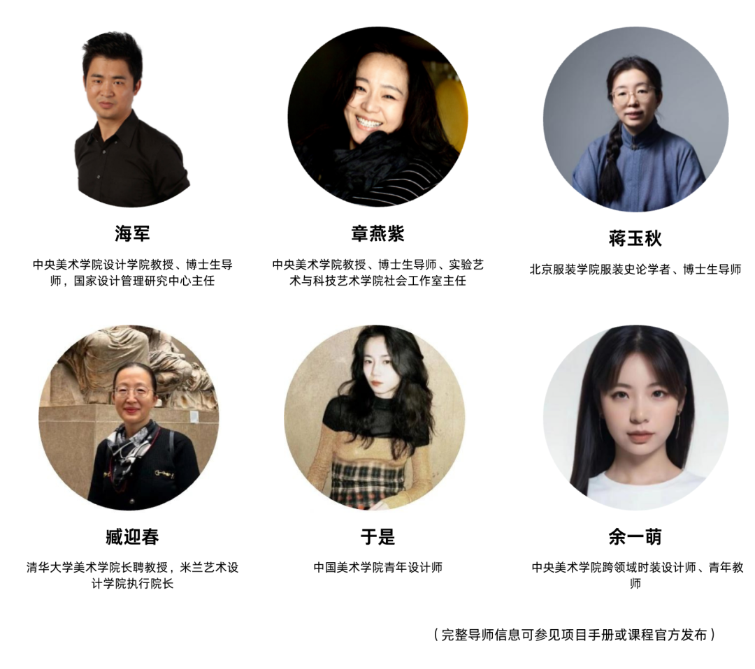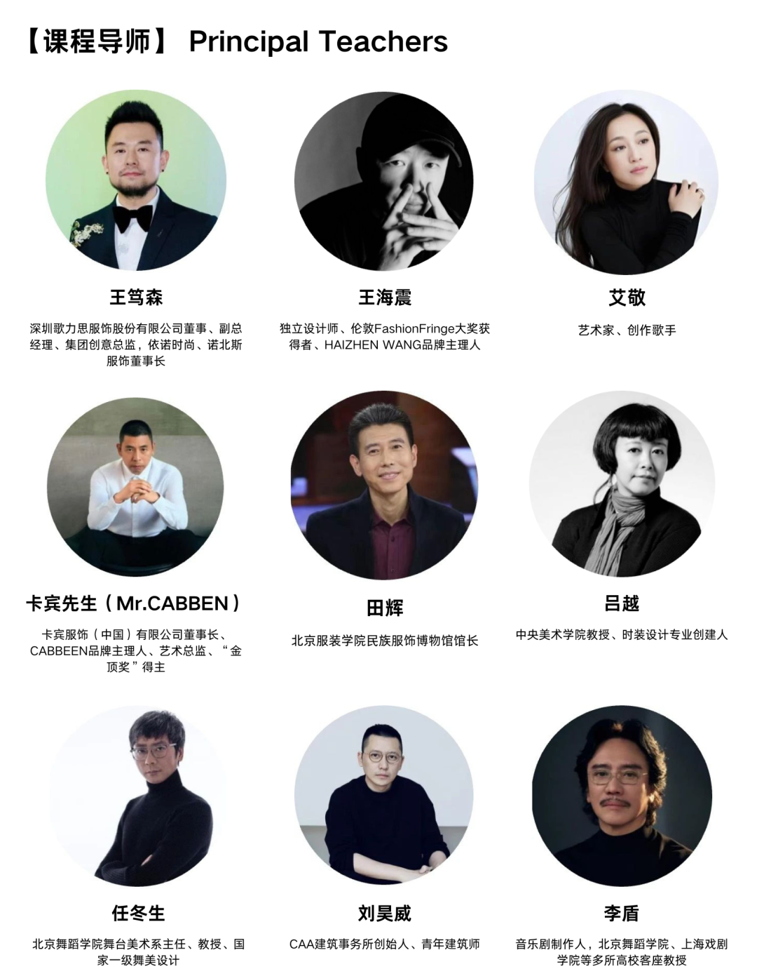 課程邀請中國及國際時尚、藝術、文化領域眾多領袖和專家共同授課。主要導師包括(按姓氏筆畫排序)