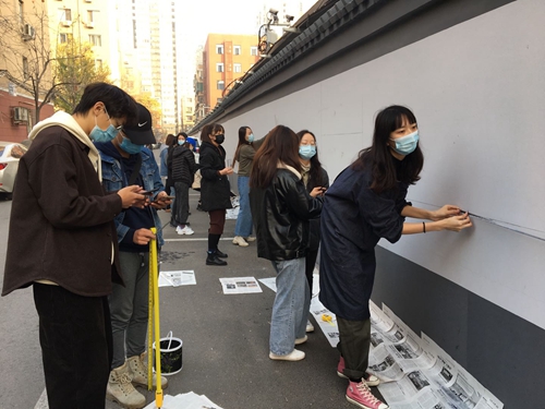 隨后,后勤基建第二、第三黨支部,美術學院黨委領導、黨團學生工作教師及學生骨干代表前往社區調研,在與芍藥居四社區工作人員溝通交流后,決定在芍藥居校區和社區延綿40余米的間隔墻上用彩繪的形式開展“垃圾分類”主題宣傳。