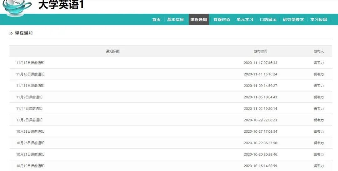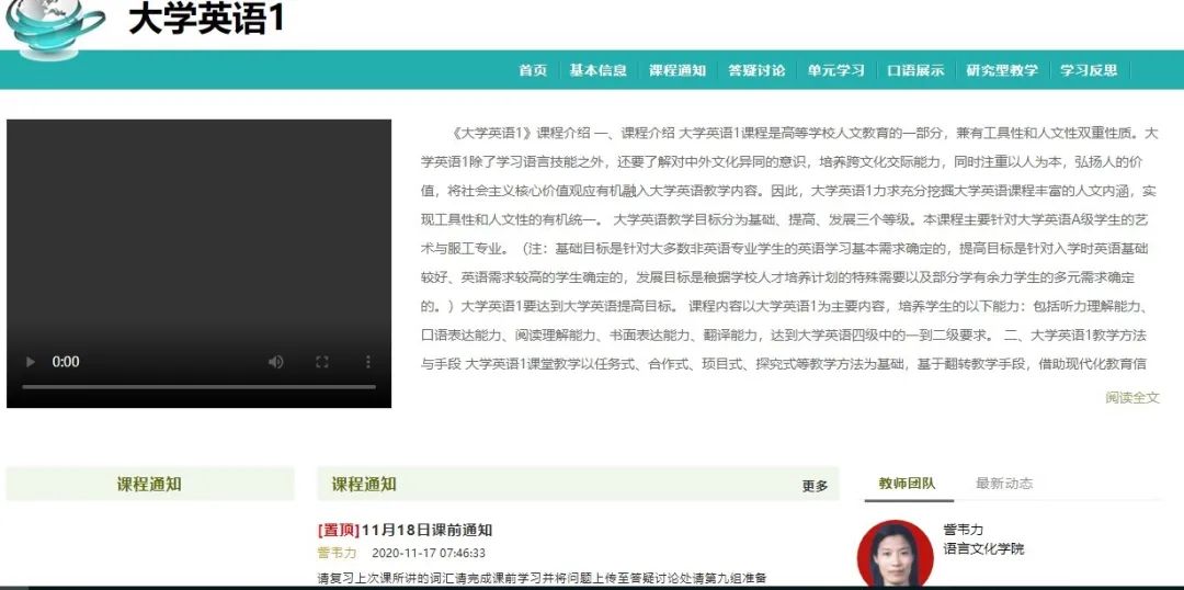 經(jīng)過幾年學(xué)習(xí)和實(shí)踐,訾老師幾乎開發(fā)和使用了在線教育綜合平臺上的所有功能,如:基本信息、課程通知、答疑管理、單元學(xué)習(xí)、口語展示、研究型教學(xué)、學(xué)習(xí)反思,實(shí)現(xiàn)了《大學(xué)英語》課程各環(huán)節(jié)信息化、網(wǎng)絡(luò)化、平臺化的教學(xué)方式。