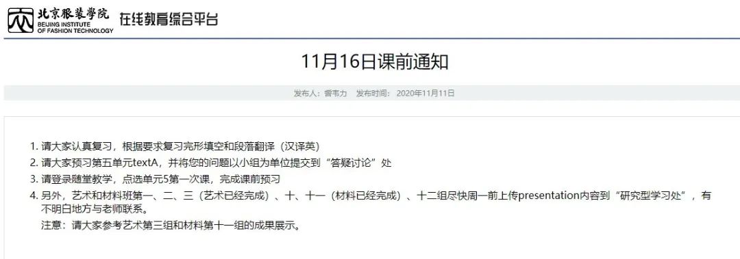 訾老師在每次上課前,將本次課上教學(xué)內(nèi)容、預(yù)習(xí)內(nèi)容、練習(xí)要求、小組PPT展示等,以通知形式在平臺上發(fā)布,學(xué)生在PC端和手機(jī)端均可看到。