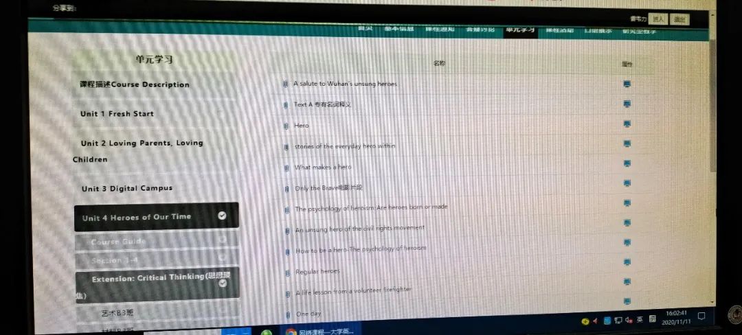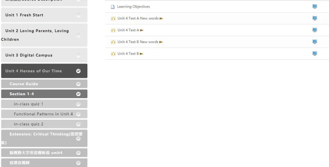 訾老師把每個單元的教學(xué)資源提供給學(xué)生預(yù)習(xí)。以《大學(xué)英語1》第四單元為例,在線教學(xué)資源包括:單元導(dǎo)讀、課文A和B單詞及課文語音資料、隨堂測驗、思想聚焦、英語視聽說和教師授課音視頻資料等。