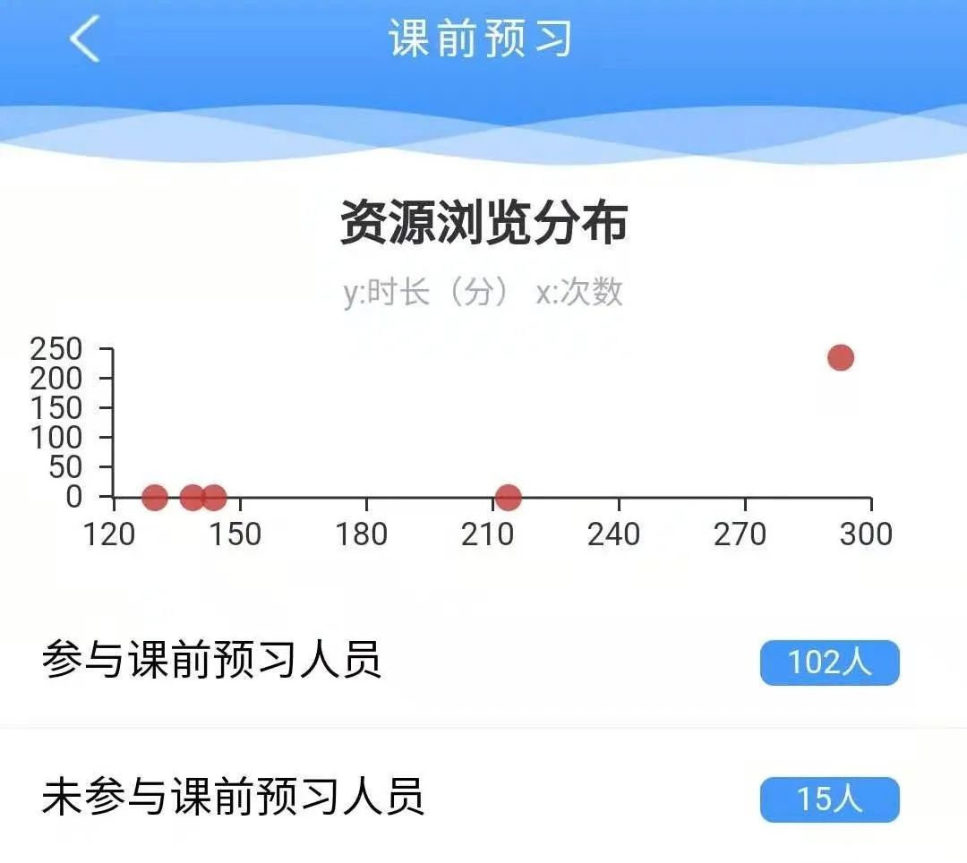 同時,老師可以在移動端監(jiān)測到學(xué)生教學(xué)資源瀏覽量,了解學(xué)生預(yù)習(xí)情況和參與人數(shù)。