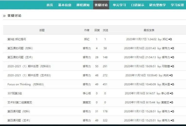 訾老師把每個班學(xué)生分成12個學(xué)習(xí)小組,以小組為單位對提問進(jìn)行答疑。以《大學(xué)英語1》第四單元為例,訾老師分別對藝術(shù)B3班各學(xué)習(xí)小組提出的49個問題和材料B3班各學(xué)習(xí)小組提出的31個進(jìn)行了答疑,在線答疑回復(fù)的工作量之驚人。期中考試后,兩個平行班的答疑回復(fù)量分別為48個(藝術(shù)B3班)和50個(材料B3班)。