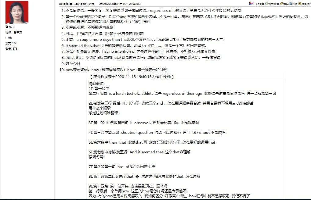 為有效利用課堂有限時間,課前學(xué)生對課文預(yù)習(xí)中遇到的不會、不懂的句子向老師提問,訾老師逐一進(jìn)行在線回復(fù)和答疑。在課堂上只針對課文中的難點(diǎn)、重點(diǎn)進(jìn)行講解,而不是通篇講授,大大提高了課堂有限時間的利用效率,學(xué)生也更加積極主動地進(jìn)行課前預(yù)習(xí)。
