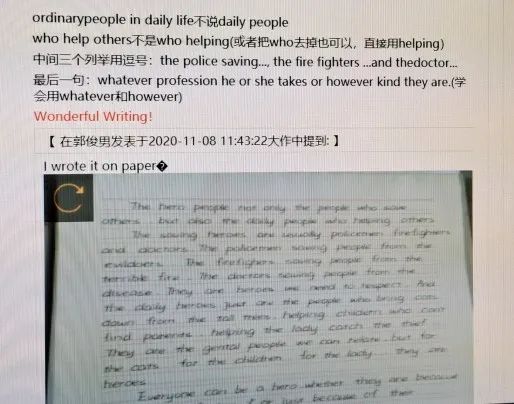 訾老師將作文與課程思政相結(jié)合,以“思想聚焦”的形式呈現(xiàn)。第四單元作文題目是:What is a hero? How do you understand the hero? 同學(xué)完成作文后,在線提交,訾老師在線進(jìn)行批改作文。很多同學(xué)手寫作文,字跡工整,字體非常漂亮。