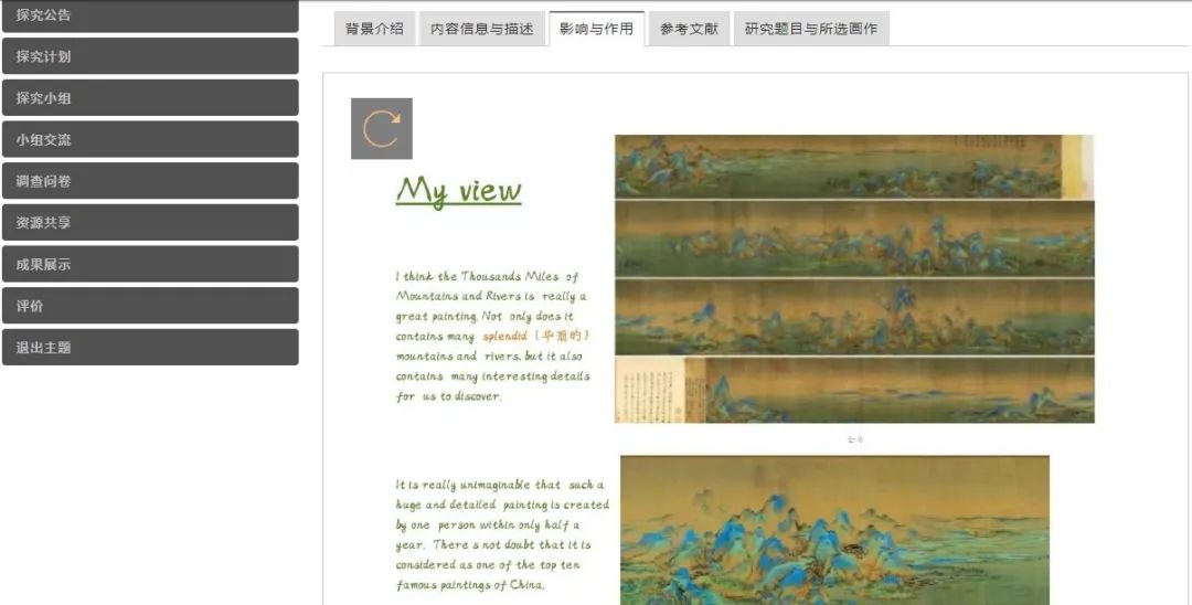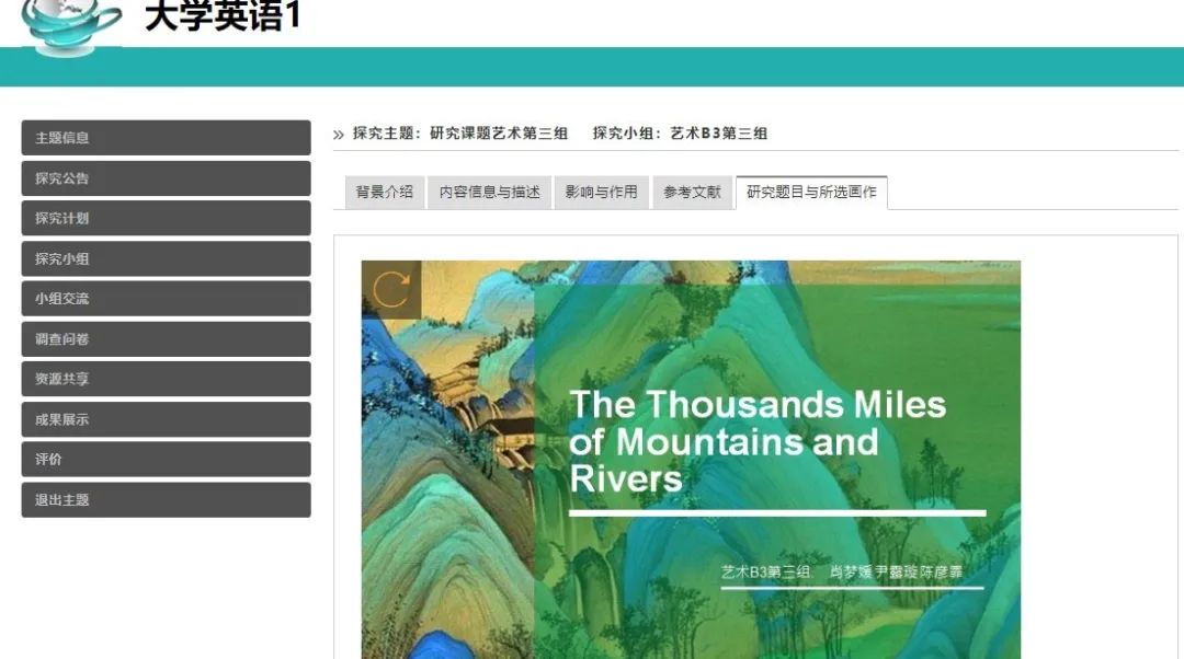 在研究型教學(xué)方面,訾老師讓學(xué)生完成小組英文口語演講,演講內(nèi)容為中外著名畫家、著名油畫、國畫等,學(xué)生在線上傳及課上演講。由于課上時間有限,一部分同學(xué)需要課下通過騰訊會議完成口語陳述。