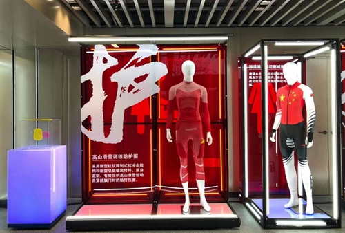 護涉及訓練比賽過程中服裝裝備的保護性能。冬季運動項目速度高、環境復雜,運動員損傷風險較大,主要有沖撞和刺割兩類損傷,多個研發單位聯合攻堅這一課題。在展示的比賽裝備中,高山滑雪訓練防護服采用新型的柱狀陣列式抗沖擊結構和新型吸能緩震材料,為運動員量身定制。能有效保護高山滑雪運動員穿越旗門時的抽打傷害。短道速比賽服則全身使用防切割面料,全面保護運動員身體,同時考慮肌肉壓縮、服裝減阻功能。