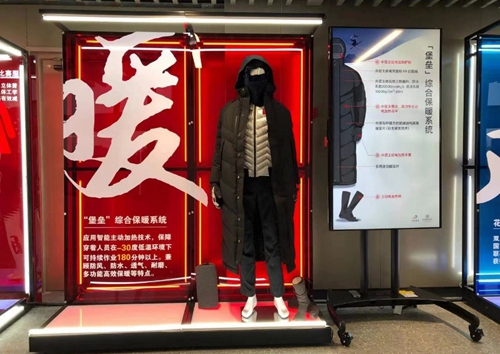 暖是冬季項目的普遍需求。今年崇禮訓練基地在1月6日達到1966年有史以來的最低溫度--零下32度,體感溫度更低,嚴重影響了運動員訓練。對于所有冬季項目都會用到“暖”。劉莉介紹,主要通過兩種途徑:一是提升纖維保暖率,二是只能主動加熱技術,把電能量轉化成熱量。在展示的裝備中,“堡壘”綜合保暖系統集防風、防水、透氣、耐磨多功能高效保暖于一體。裝備包含主動電加熱護臉、馬甲、手套、襪子、坐墊。在-30度環境下可持續作業180分鐘以上,全方位保護人體。