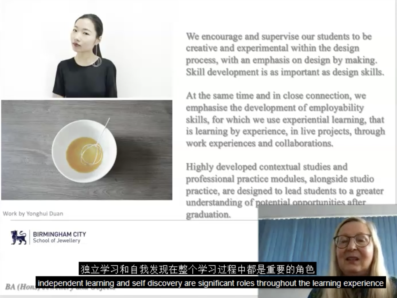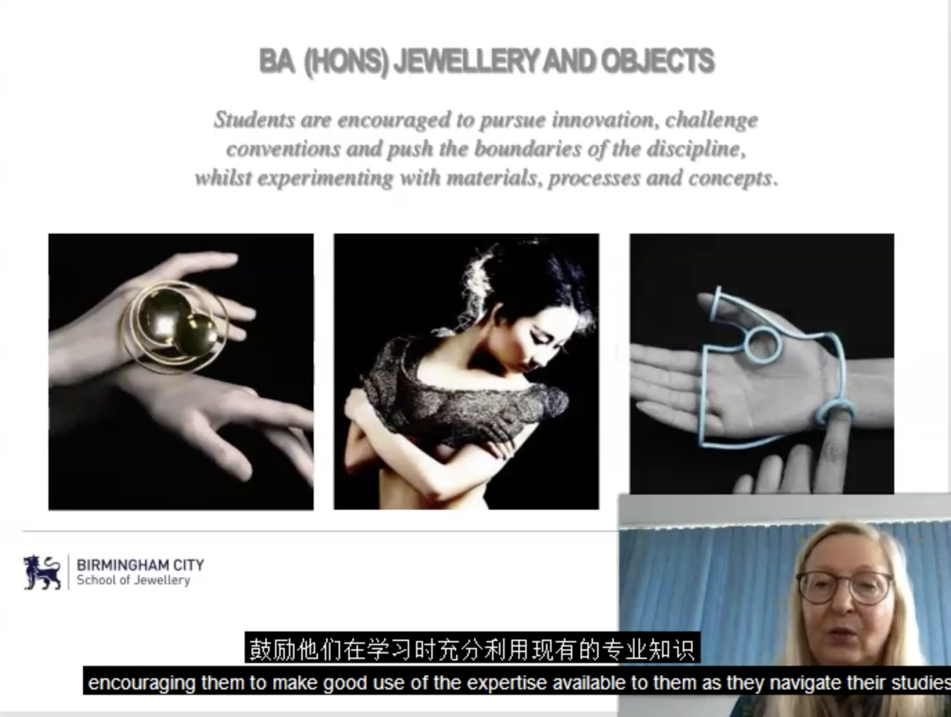 首先,英國伯明翰城市大學珠寶學院Jivan Astfalck(吉萬.阿斯特法爾克)教授通過網絡視頻的方式和大家分享了關于伯明翰城市大學珠寶學院的教學理念,呈現了以拓展思維與批判意識為主體的西方當代首飾教學觀,分享了以創新為基礎的多元化的課程成果。