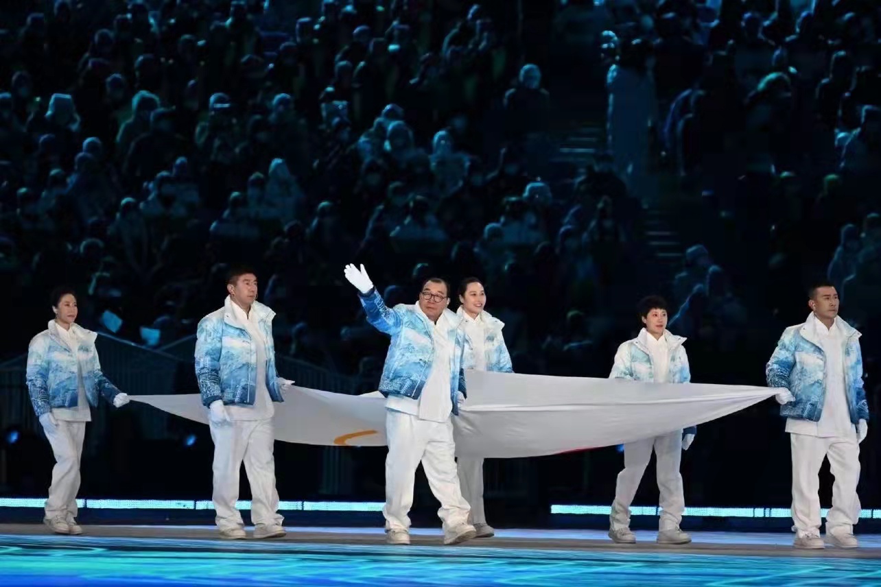 5、舉旗手服裝設計的靈感源于北京2022年冬奧會的官方視覺圖案,圖形的設計展現了中國傳統的“道法自然、天人合一”思想,融合了京張賽區山形及長城形態,以及《千里江山圖》中的青綠山水、具有中國書法韻味的冬季美景。