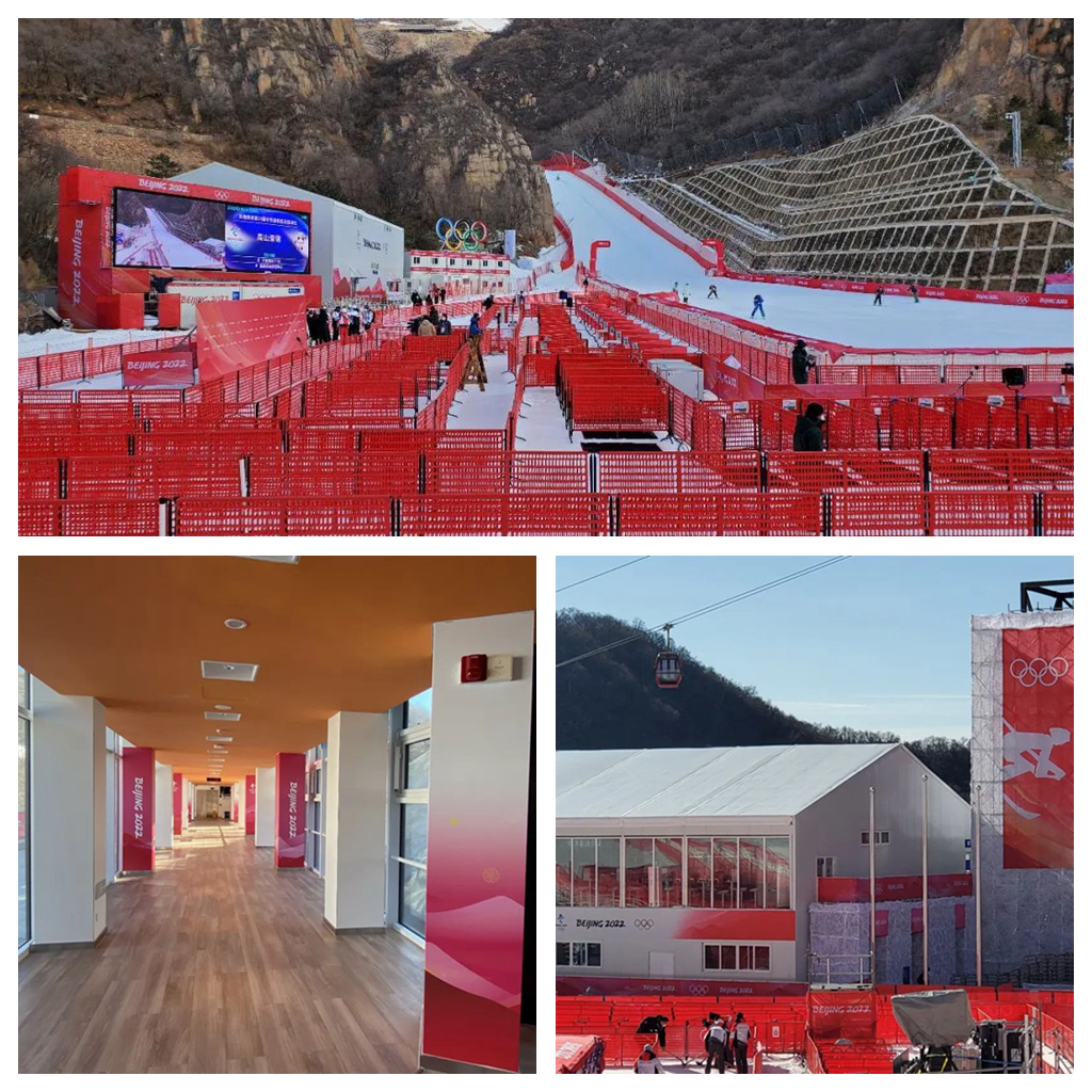 形象景觀設計方案圍繞服務比賽功能的原則,做到條理清晰、內外有別。運用霞光紅、天霽藍、冰藍等色彩,結合核心圖形中的綿延山形,展現出高山滑雪特征與運動之美。同時恰當烘托賽事氣氛,明確區域、動線識別,融合天然山形景色,營造出雪畫冰印的意境。