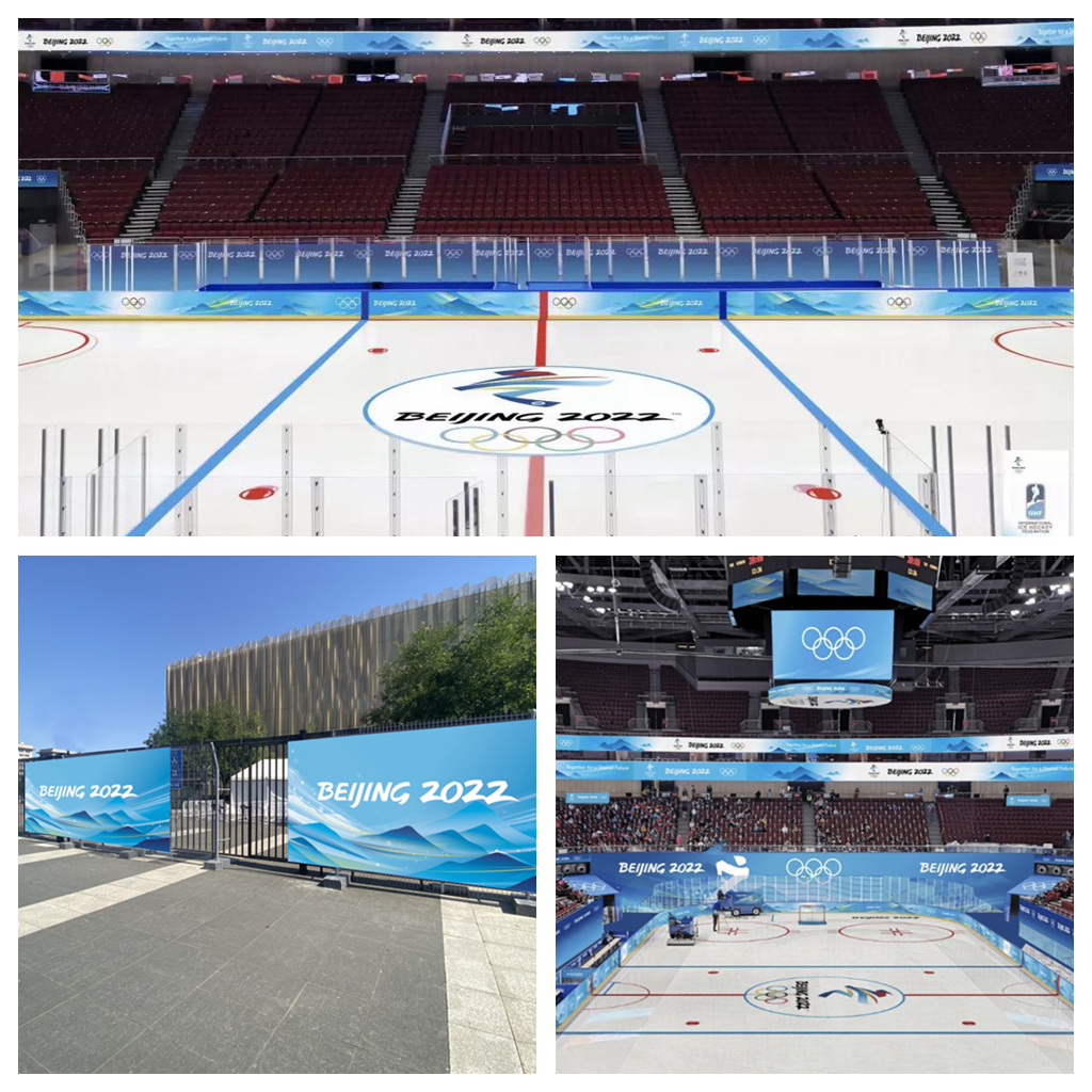 五棵松體育中心作為舉辦冬奧會冰球項目的場館,其形象景觀設計由北京服裝學院與清華美院共同完成。形象景觀以冰藍色為主色,竹綠色為輔色。在場館內外的FOP競賽區,結合場館屏幕、建筑立面進行設計,將動線、節點合理布局,營造有序且象征團結的景觀,助力賽時氛圍的營造。