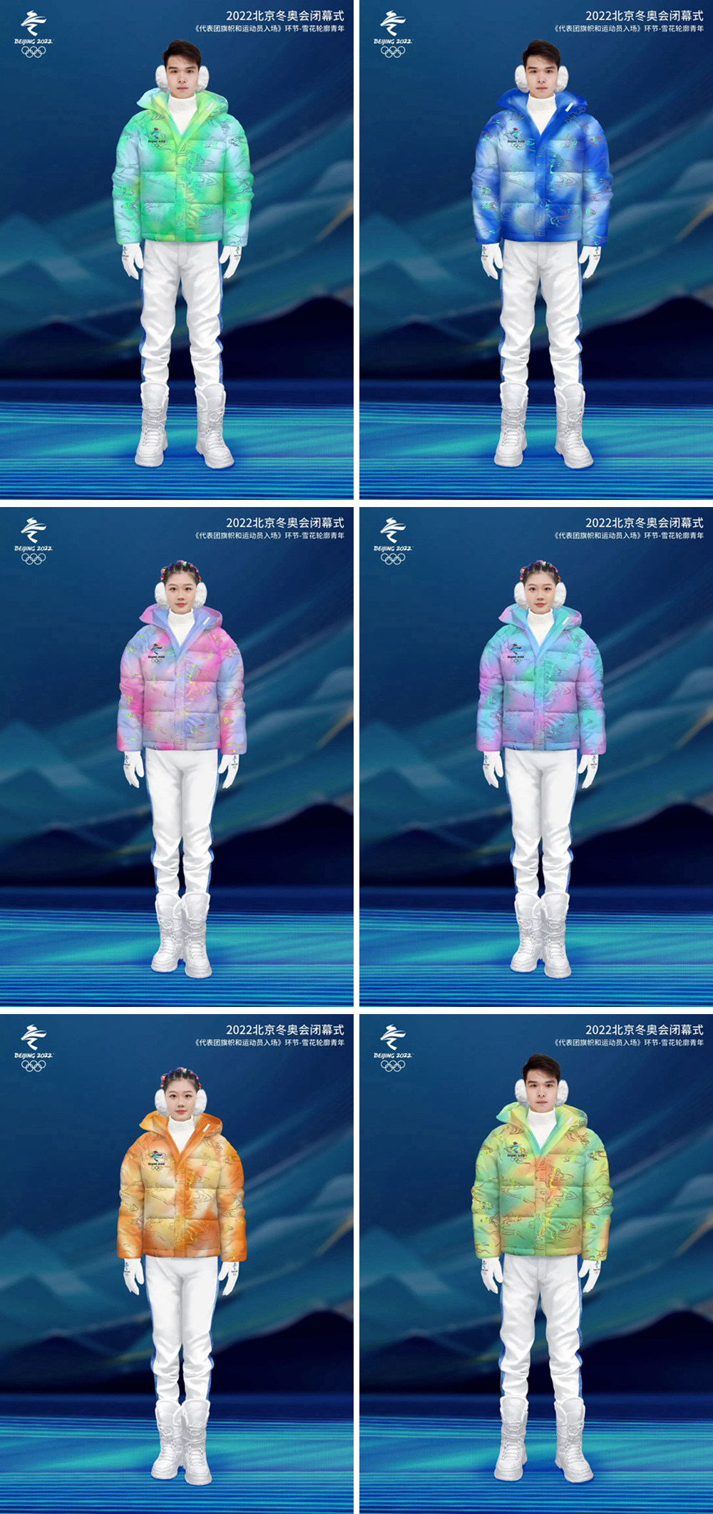 引導(dǎo)代表團(tuán)旗幟和運(yùn)動員入場的表演青年是整個冬奧會閉幕式極其重要的“環(huán)境氛圍”,此套服飾設(shè)計立意于中國經(jīng)典傳統(tǒng)紋樣“祥云”元素,祥瑞之云氣,傳遞的是吉祥、喜慶、幸福的愿望,祥云迎接運(yùn)動員入場寓意著以中國最美好的祝愿迎接世界各地的運(yùn)動健兒們。