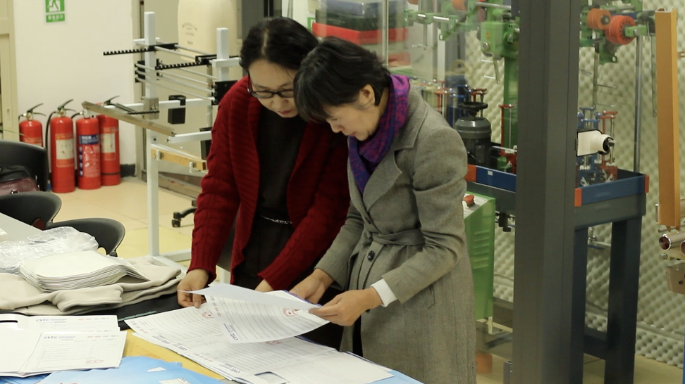 2019年是從里忙到外的一年。校外忙奔波調研、與各家企業接觸,校內忙實驗室研究、開發與檢測。時間推進到2019年初的時候,我們開始對接多家企業,多方溝通,通過實地調研探尋科技面料落地的最大可實現性。因為要走訪的企業很多,我們在調研中做到:每天至少走訪兩家企業。即使很多時候時間緊張,但是企業負責人都高度配合,抓住一切細碎時間幫助我們實現實地考察,帶我們參觀打樣間,盡可能細致地為我們介紹面料性能、展示面料工藝。從北方到南方,從山東到江浙、廣東、福建,所行之處都能感受到企業的高度配合與熱情,還有“紡織人”的真誠、國民心系國家重大事件的熱情。在調研、實驗室研究過程中,我們還需要不斷地與北京冬奧組委和安踏企業接洽,商定產品品類、以便準確定位各類服裝材料。
