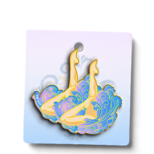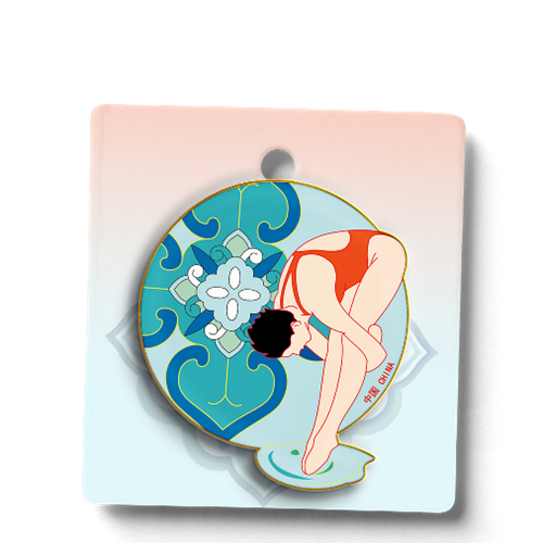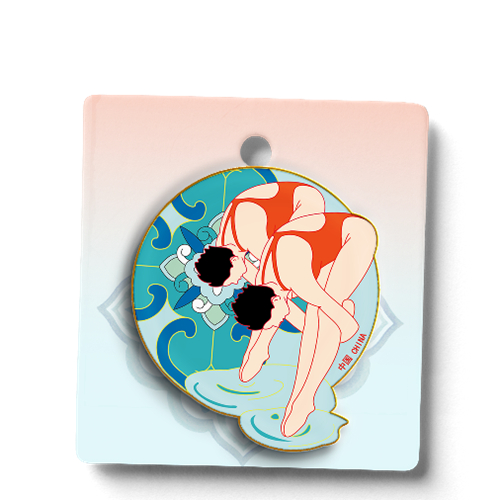 靈感來自于中國柿蒂紋與跳水運動員的意向提煉,描繪跳水運動員在空中進入水中前的精彩時刻,伴隨著柿蒂紋與圓形結合,代表著圓滿入水的美好期盼。圓形象征著明日與皎月,代表運動員日夜訓練穿梭于這自然圖景中。