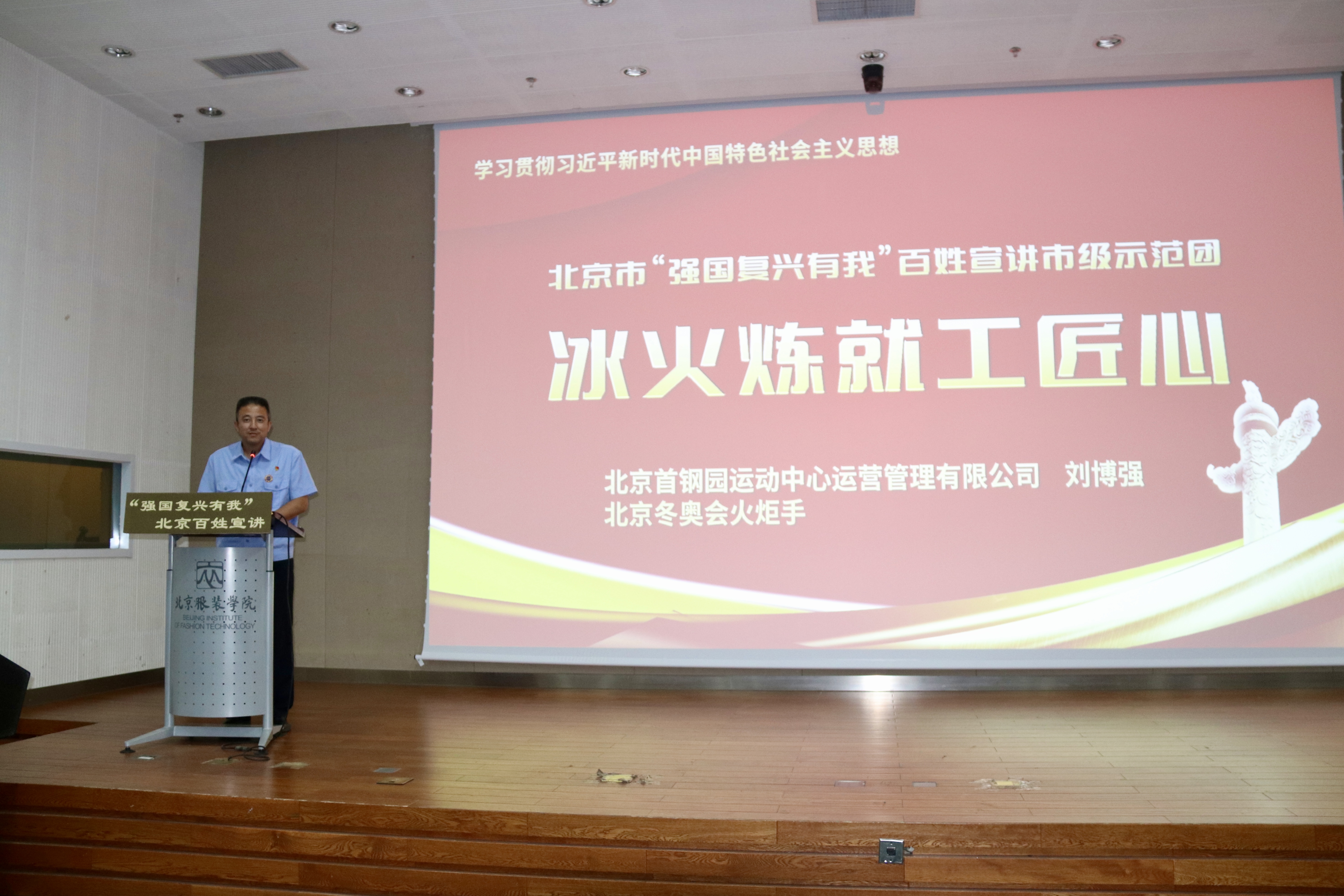 五位宣講員用第一視角講述新時代拼搏奮斗故事,感人至深、催人奮進。北京服裝學院2010屆校友張建平是派駐北京市門頭溝區洪水峪村的第一書記、國家級非遺口技第四代傳承人,她講述了自己扎根鄉村、傳承非遺,用中國優秀傳統文化助力美麗鄉村建設的動人故事;國藥集團工業有限公司辦公室主任暴曉燕是一名RH陰性稀有血型的獻血志愿者,她講述了自己堅持無償獻血并帶動全家人獻血的感人故事; 北京大運河禮物文化發展有限公司總經理馮建革講述了圍繞運河文化,自己組建設計團隊,將大運河橋下的鎮水獸形象開發成象征祈福平安的文創產品并走向國際舞臺的心路歷程;北京藝術中心孫徽介紹了為確保觀眾廳里每個座席都有良好的聽感體驗,遍邀國內外各路頂尖聲學專家、指揮家、演奏家等,對各項細節進行耐心調試,成功邀請國內外一流的藝術家前來演出的奮斗故事;北京首鋼園運動中心運營管理有限公司制冰師劉博強娓娓道來自己從一個冰雪門外漢成功蛻變為制冰大工匠,完成從“火”到“冰”的跨界。