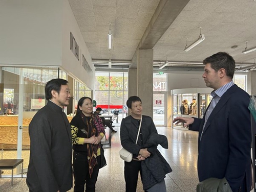 26日下午,代表團一行與阿爾托大學藝術設計學院院長Tuomas Auvinen進行座談。Tuomas Auvinen對代表團的到來表示歡迎并介紹學院基本情況。賈榮林介紹了學校發展歷程、二級學院及產教融合開展情況,他表示北服依托特色和優勢,重視國際交流合作和國際視野人才培養,也與 Tuomas Auvinen院長達成回訪北服的意向。