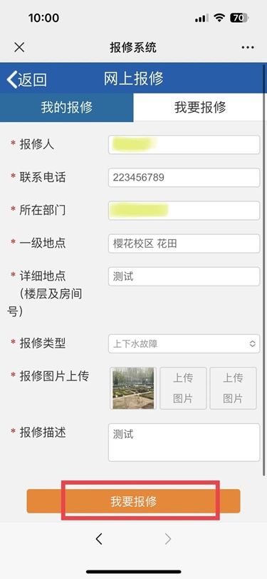 選擇校區后在地圖中點擊對應的報修地點前往詳情頁面,以櫻花園校區花田報修為例,點擊“花田”—填寫所需內容—“我要報修”,即可完成。