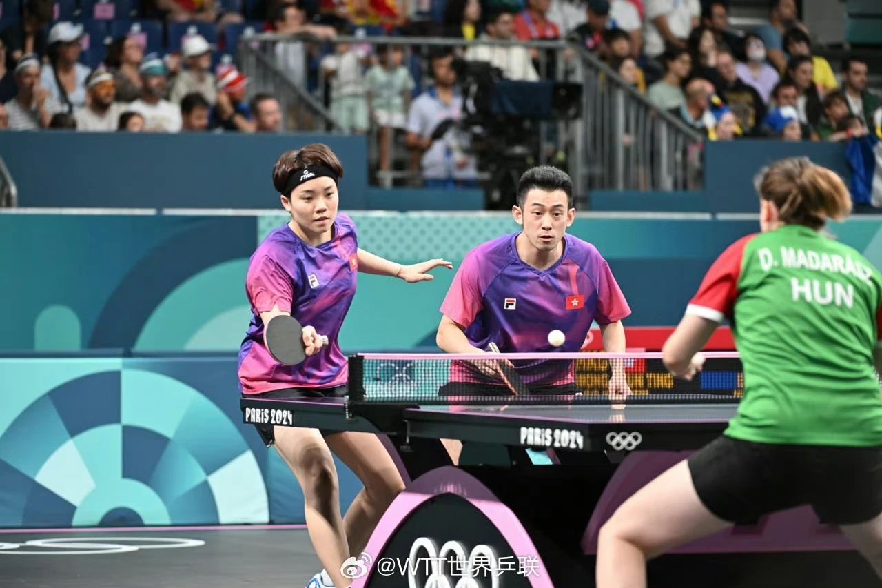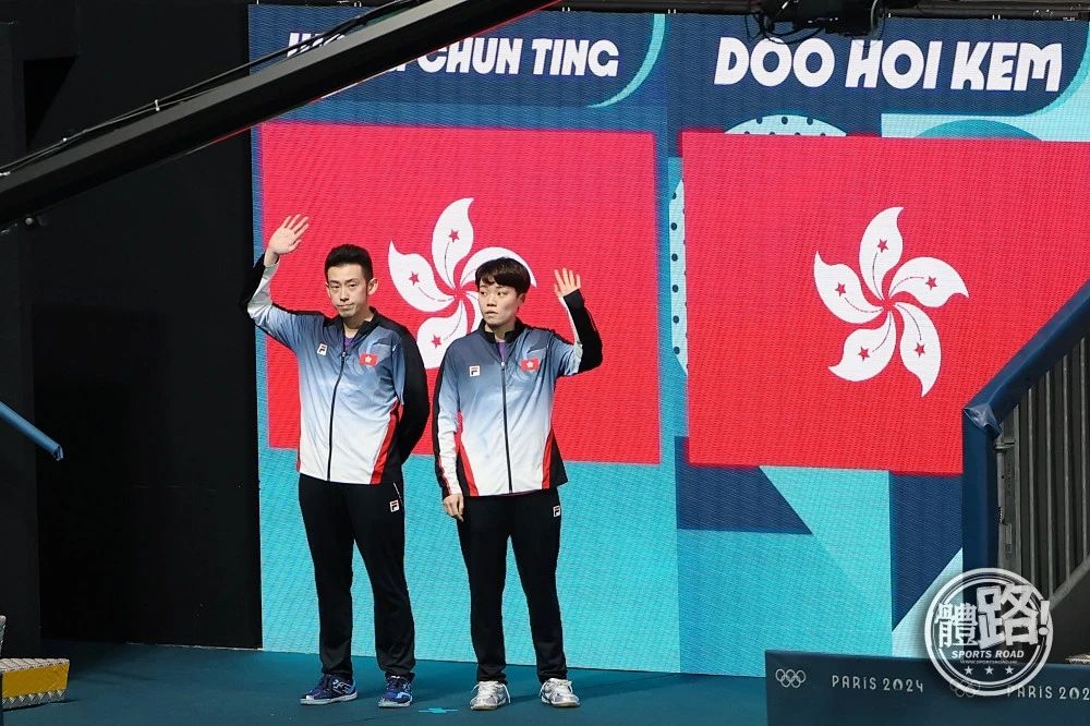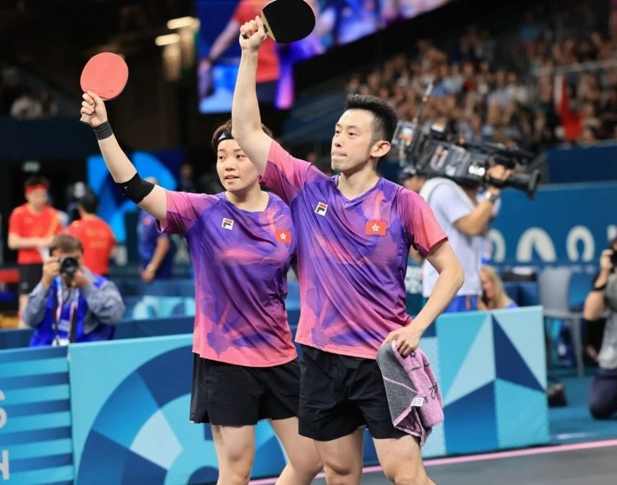 中國香港組合黃鎮(zhèn)廷/杜凱琹穿著乒乓球隊出場服