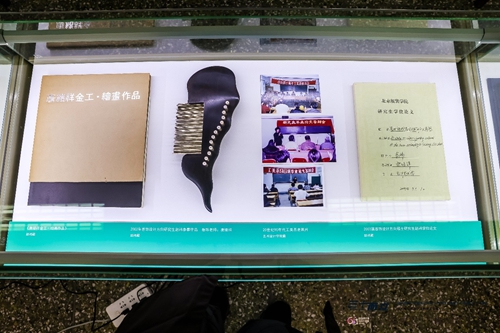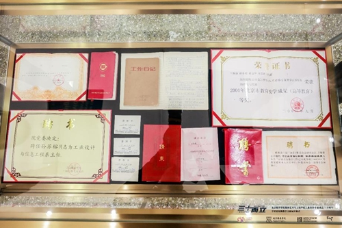 該展柜圍繞“師承”主題,精心展出產品設計專業珠寶首飾模塊創始人唐續祥教授老照片和作品,以及他指導當時的研究生、后成為該領域骨干的趙祎教授完成的參賽作品和畢業論文。展品強調了兩代教育者之間的傳承關系,體現知識、技能以及教育理念的延續性。