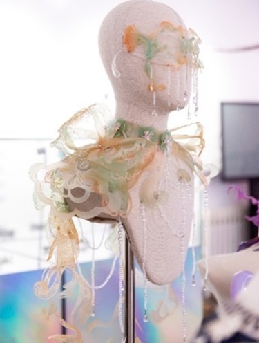 該作品以中國傳統非遺花絲細金工藝為研究對象,結合數字技術開發造型生成系統、3D動態視覺、XR影像、AR穿戴裝置及實體作品,推動非遺在新時代的發展。