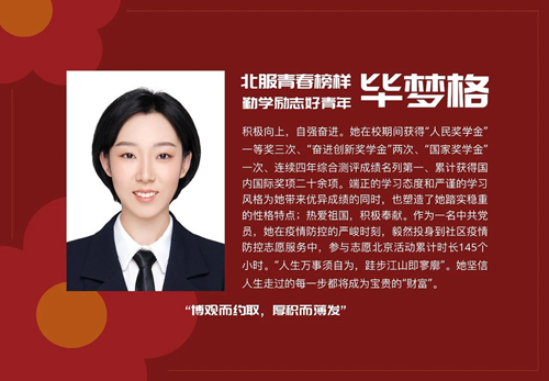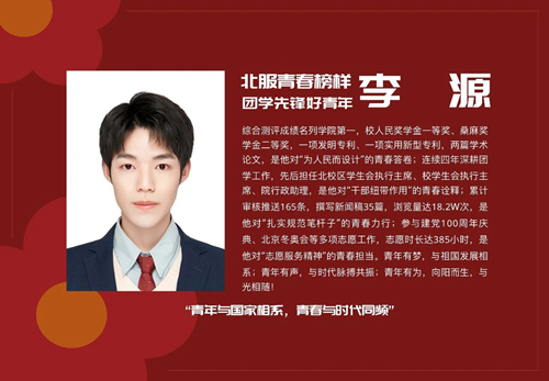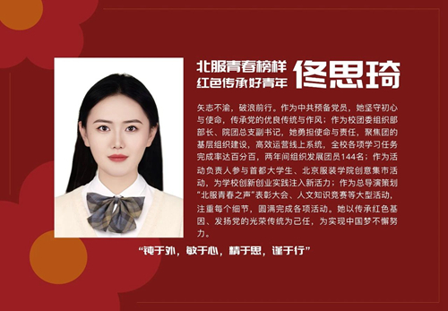 習近平總書記指出,當代中國青年是與新時代同向同行、共同前進的一代,生逢盛世,肩負重任。習近平總書記的寄語為北服青年努力奮斗指明方向。北服青年學子將永懷赤誠與感動,在榜樣的感召下汲取百折不撓的積極力量、砥礪奮進的拼搏精神、開朗樂觀的生活態度,跑好歷史的接力棒,書寫無愧于自己、無愧于黨和人民的青春華章。