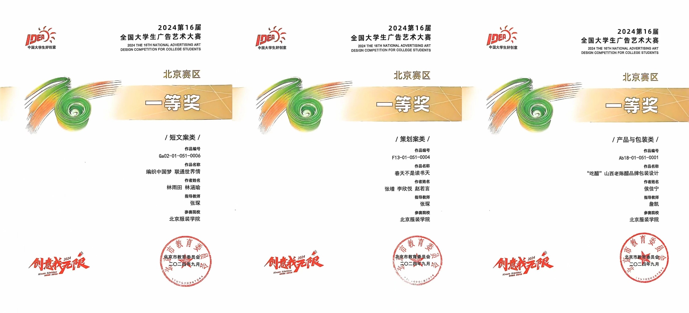 北服師生獲得一等獎證書