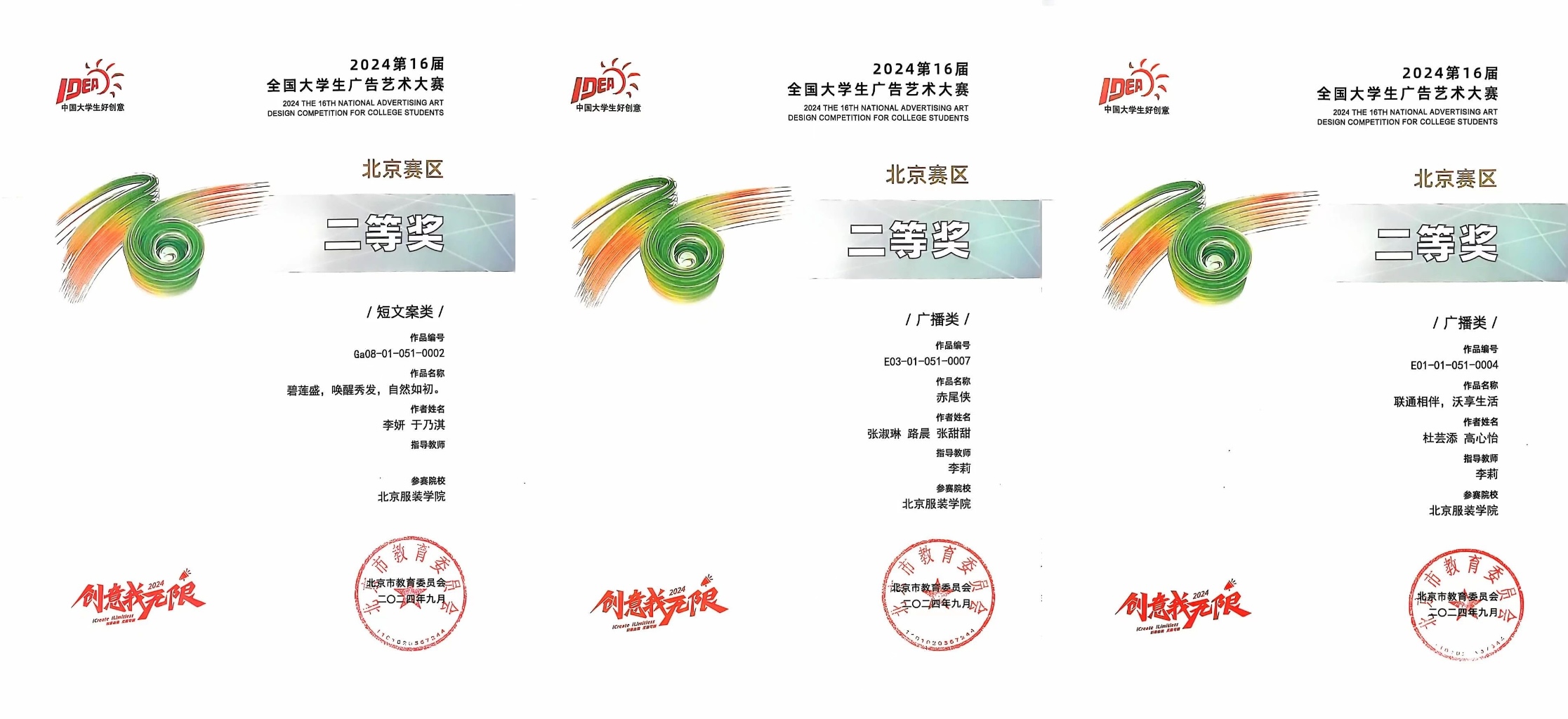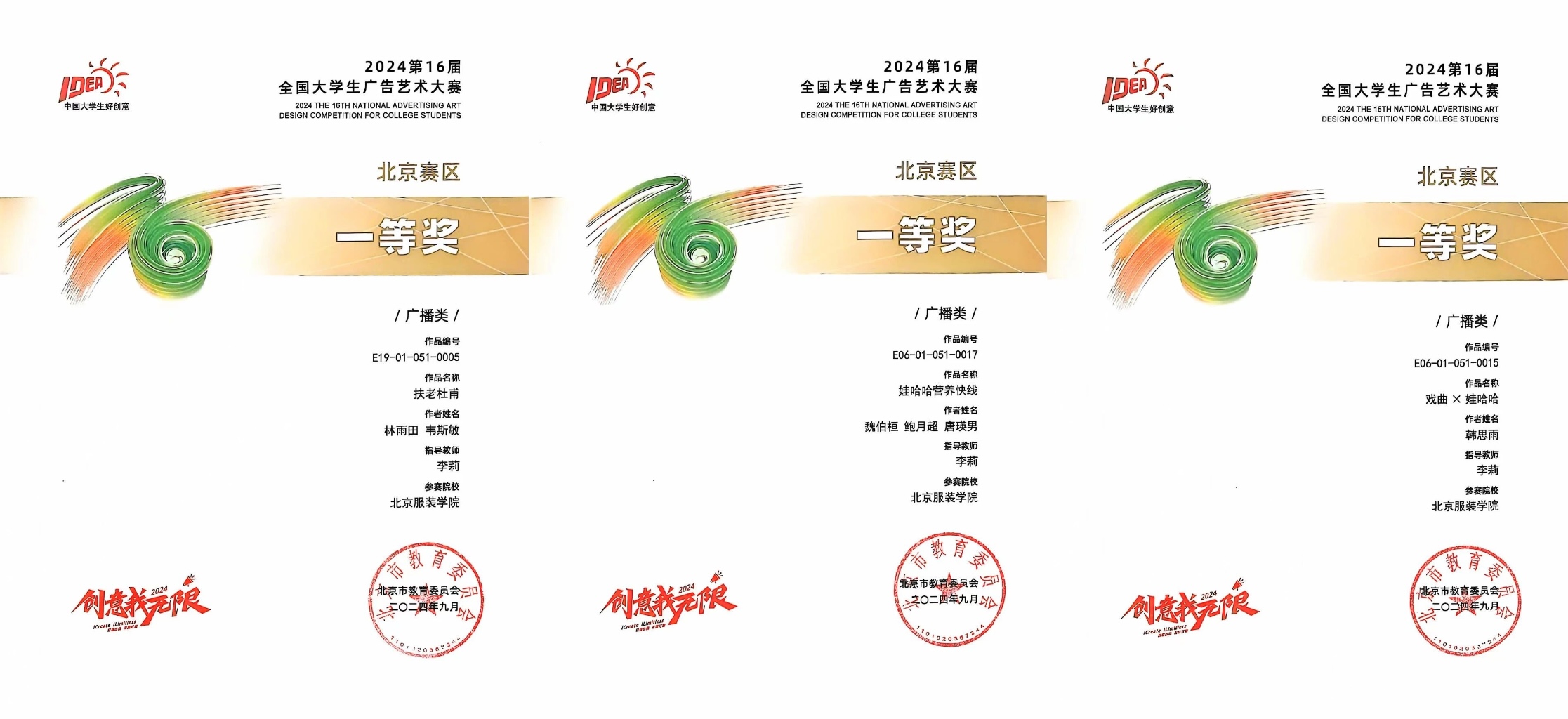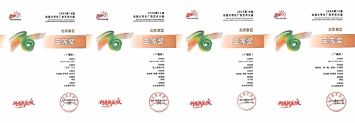我校在本屆大廣賽北京賽區(qū)比賽中共斬獲一等獎11個、二等獎19個、三等獎22個,參賽學(xué)生分別來自時尚傳播學(xué)院、藝術(shù)設(shè)計學(xué)院、美術(shù)學(xué)院和商學(xué)院。時尚傳播學(xué)院教師李莉獲評北京市教育委員會頒發(fā)的“北京賽區(qū)優(yōu)秀指導(dǎo)教師”榮譽(yù)稱號(北京賽區(qū)共30位)。我校獲評北京市教育委員會頒發(fā)的“北京賽區(qū)優(yōu)秀組織單位” (北京賽區(qū)共10個)。