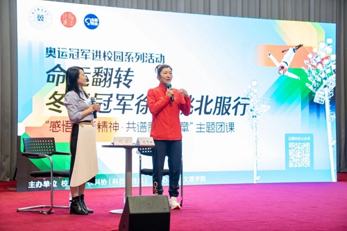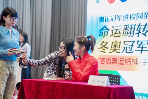 團(tuán)課分為對話座談、互動(dòng)提問、新書簽字三部分。徐夢桃生動(dòng)回顧了奧運(yùn)奪金時(shí)刻,講述了“冬奧冠軍是如何煉成的”“到底怎樣才能實(shí)現(xiàn)命運(yùn)的翻轉(zhuǎn)”等,使在場師生了解到奪冠背后的艱辛與汗水,感受體育運(yùn)動(dòng)的強(qiáng)大精神與力量。