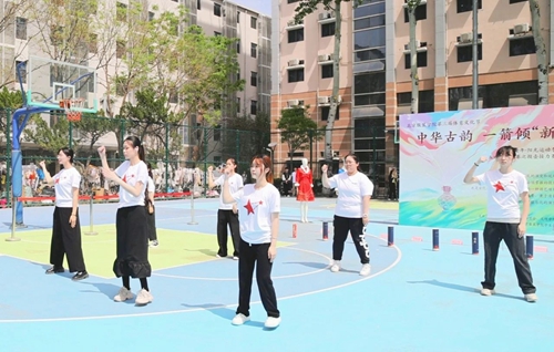徐夢桃首先來到操場,與師生一同參與“北服青年·陽光運(yùn)動(dòng)季”五四體育聯(lián)賽中之趣味投壺賽項(xiàng)。活動(dòng)還邀請北京航空航天大學(xué)、北京體育大學(xué)、北京中醫(yī)藥大學(xué)、中華女子學(xué)院等兄弟院校學(xué)生代表一同參與。在觀看同學(xué)們的《一起向未來》手勢舞表演后,徐夢桃與校領(lǐng)導(dǎo)共同為投壺比賽開賽,并興致勃勃地參與了“中華古韻 一箭傾‘新’”比賽,體驗(yàn)傳統(tǒng)體育項(xiàng)目的魅力。
