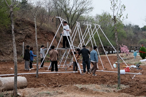 環(huán)境設計系《環(huán)藝創(chuàng)新工作營》課程李政、張樂、趙冠男、金巖、陳望五位教師,與峪口鎮(zhèn)東樊各莊村干部進行深入交流,明確目標,發(fā)揮教育部樣板黨支部的先鋒作用和 “北京高校課程思政示范課程教學名師和團隊”實力,以“鄉(xiāng)村振興”為課題主線,發(fā)揮北服特色及美育優(yōu)勢,以勞潤徳、以勞育美、立德樹人。在大地藝術(shù)節(jié)這樣一場創(chuàng)意集中迸發(fā)的集體活動中,訓練學生們藝術(shù)創(chuàng)新思維的同時,強調(diào)落地性及動手實施的能力。五位教師帶領學生開展真題真做真實踐,讓專業(yè)創(chuàng)新教育與思政、美育、勞育緊密結(jié)合。培養(yǎng)具有未來實踐力、家國情懷和社會責任感的設計人才。