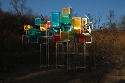 作品將光與空間媒介融合,設計出圍合的空間來限制觀者的行動,加以彩色陽光板隨著太陽東升西落的變化,創(chuàng)造出多元動線。觀者會看到一個個模糊的光盒懸浮在空間之中,隨著視線的移動,由裝置底部反射出的光的紋理逐漸清晰,有限的空間通過光的反射無限蔓延。