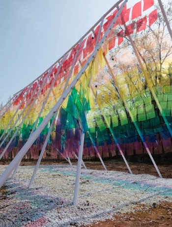 聽山上的風,看山谷的景,遇山下的人。《第六空間》即是第六感——直覺。循規(guī)蹈矩的路途、司空見慣的術(shù)語通通丟到腦后,感受內(nèi)心,跟隨直覺前進。作品以荷蘭風格派蒙特里安的設計作品為靈感,形成強烈色彩濃度的休憩空間,周圍環(huán)境的景色和設計作品巧妙融合,在空間中營造畫中景色,給游人帶來心靈和身體的雙重享受。