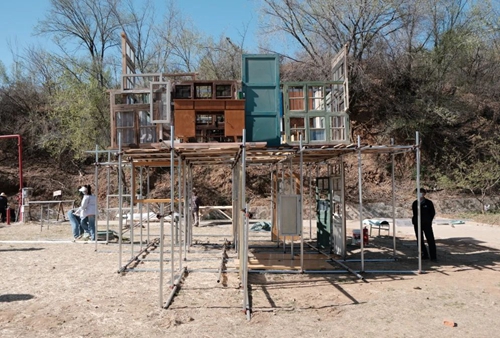 五位教師自2023年9月始,帶領60多名本科生調(diào)研、踏勘。以真實的落地項目作為標準,反復驗證設計。經(jīng)過校內(nèi)審稿、鎮(zhèn)政府匯報、落地選址、工藝實施細則模擬等諸多工作,在今年4月12日入場,從搭建到完工用時7天,每個設計小組分工明確、工作有序、考慮問題嚴謹,大大縮短建造時間和建造成本,為整個大地藝術(shù)節(jié)的順利舉辦提供了強有力的支持。本次大地藝術(shù)節(jié)的設計和實施過程也獲得了鎮(zhèn)政府和村集體的高度評價。